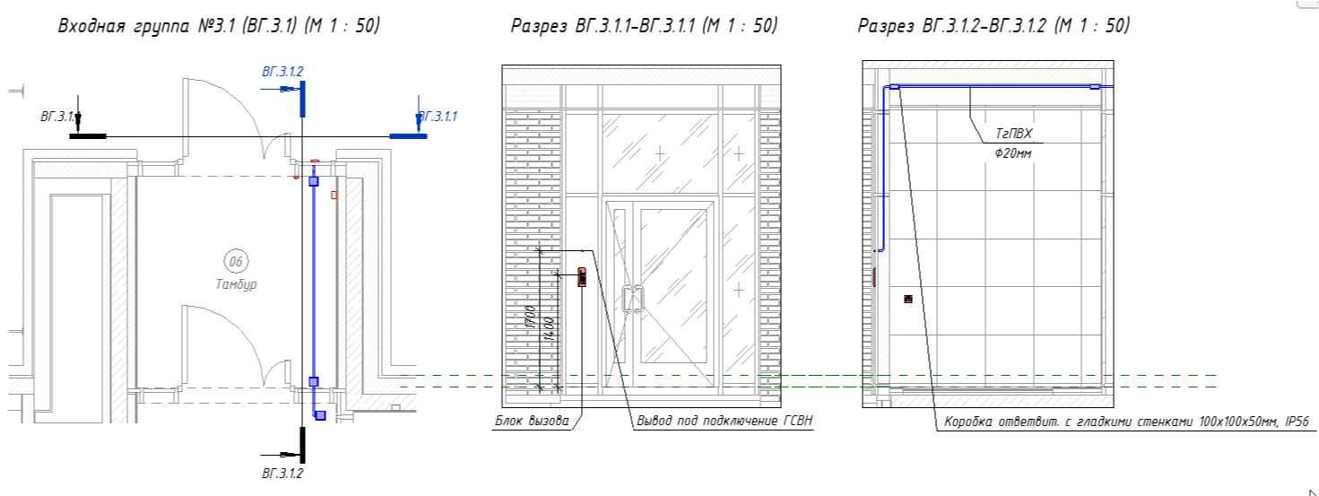 именно в самих узлах) строим разрезы с видом на входную группу и видом на опуск гофрированной трубы к выводу. К разрезам применяем шаблон