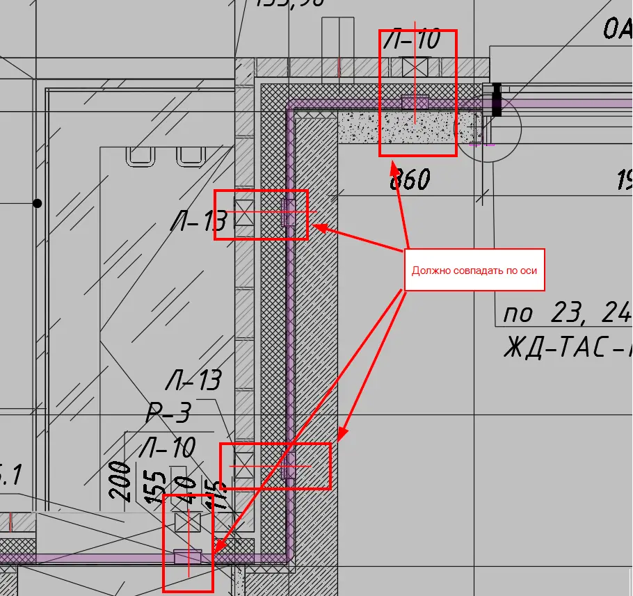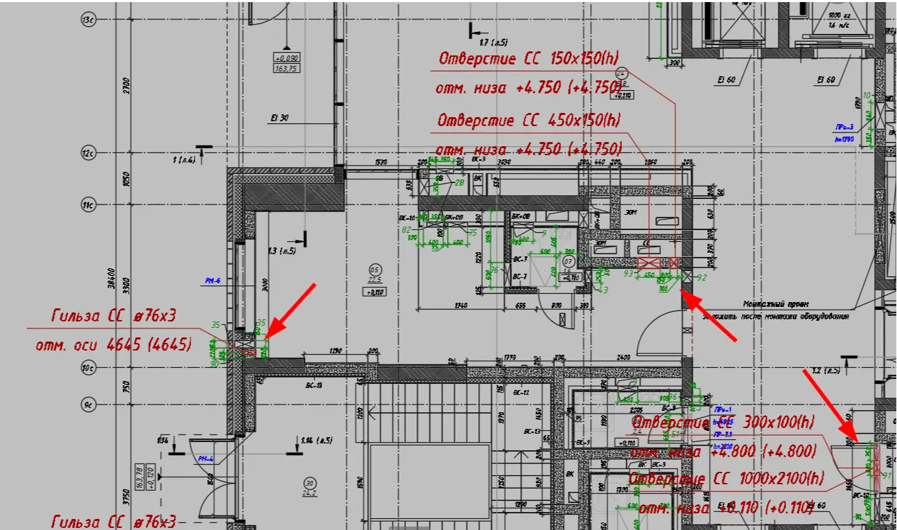 3. На сервере проектов в Исходящие открываем файлы dwg в папке гггг-мм-дд Задание к АР, отверстия на 1 этаже, v....Выделяем все, зажимаем Сtrl+Shift+C и ставим базовую точку в пересечении осей (подложка должна быть заблокирована).