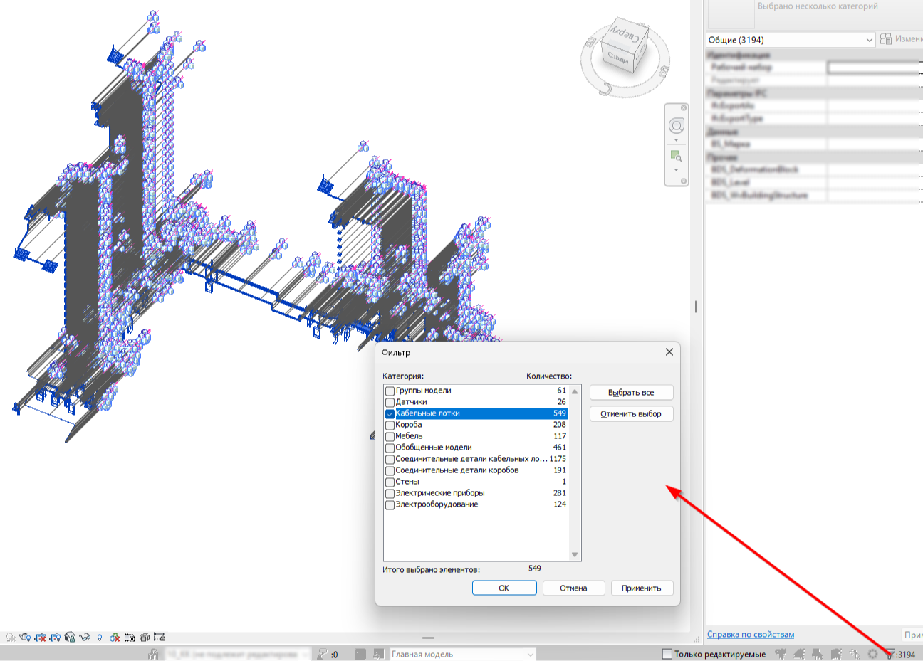 Вариант 1 (ручной) 1. Открываем настроенный 3D вид со всеми элементами 2. Выделяем все элементы и через стандартный элемент Фильтрация, оставляем только нужную категорию.